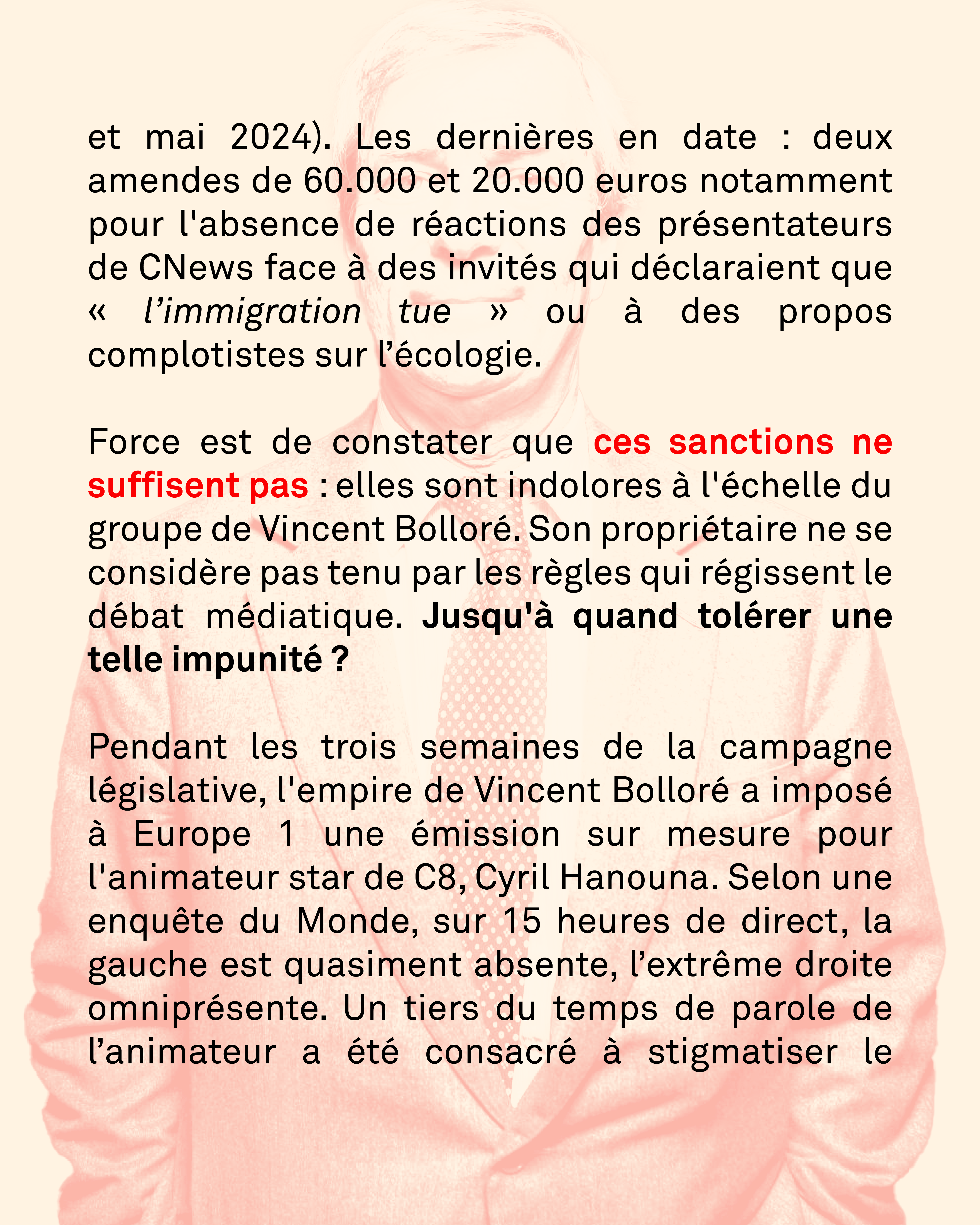 Force est de constater que ces sanctions ne suffisent pas : elles sont indolores à l'échelle du groupe de Vincent Bolloré. Son propriétaire ne se considère pas tenu par les règles qui régissent le débat médiatique. Jusqu'à quand tolérer une telle impunité ?