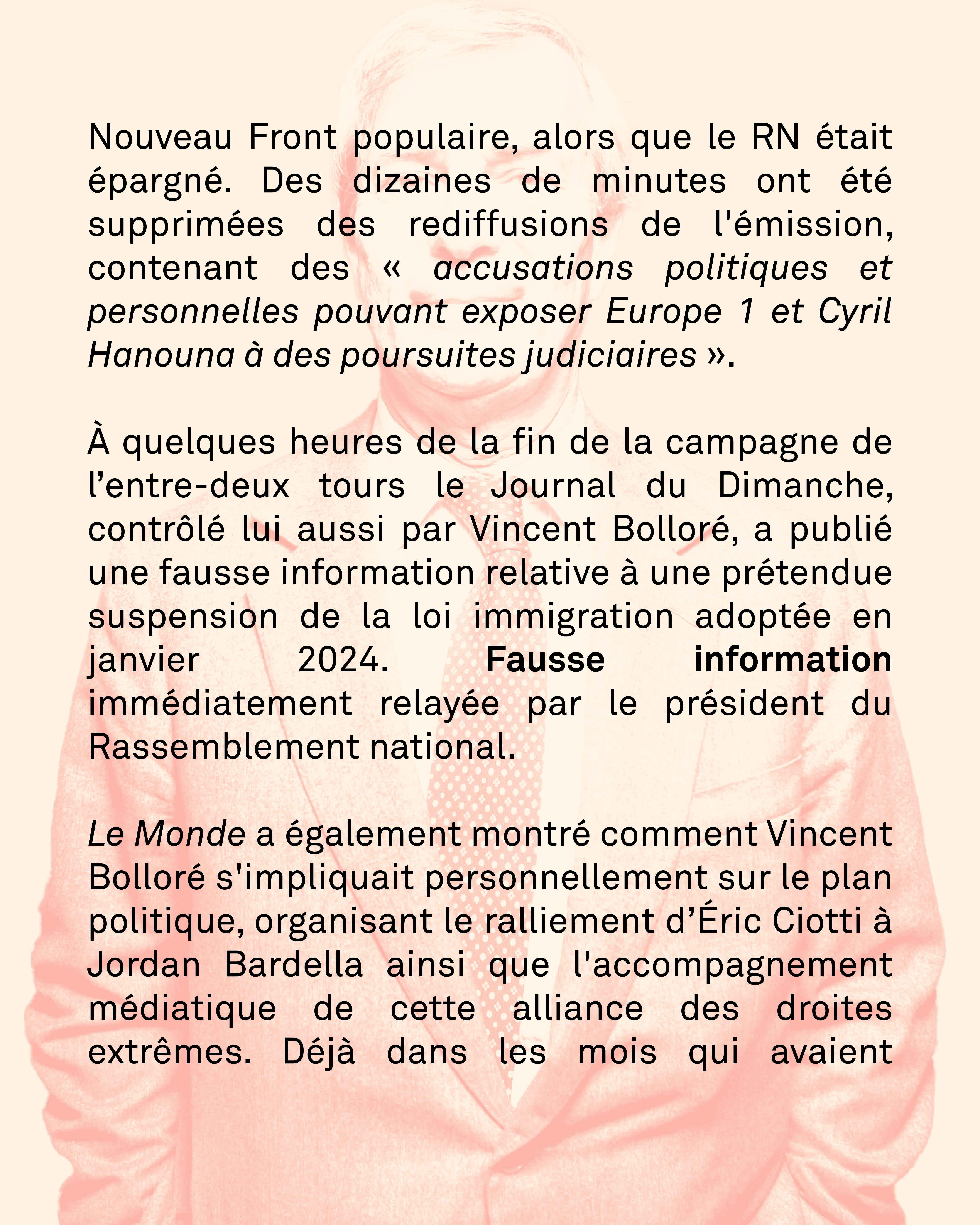 Pendant les trois semaines de la campagne législative, l'empire de Vincent Bolloré a imposé à Europe 1 une émission sur mesure pour l'animateur star de C8, Cyril Hanouna. Selon une enquête du Monde, sur quinze heures de direct, la gauche est quasiment absente, l’extrême droite omniprésente. Un tiers du temps de parole de l’animateur a été consacré à stigmatiser le Nouveau Front populaire, alors que le RN était épargné. Des dizaines de minutes ont été supprimées des rediffusions de l'émission, contenant des « accusations politiques et personnelles pouvant exposer Europe 1 et Cyril Hanouna à des poursuites judiciaires ».