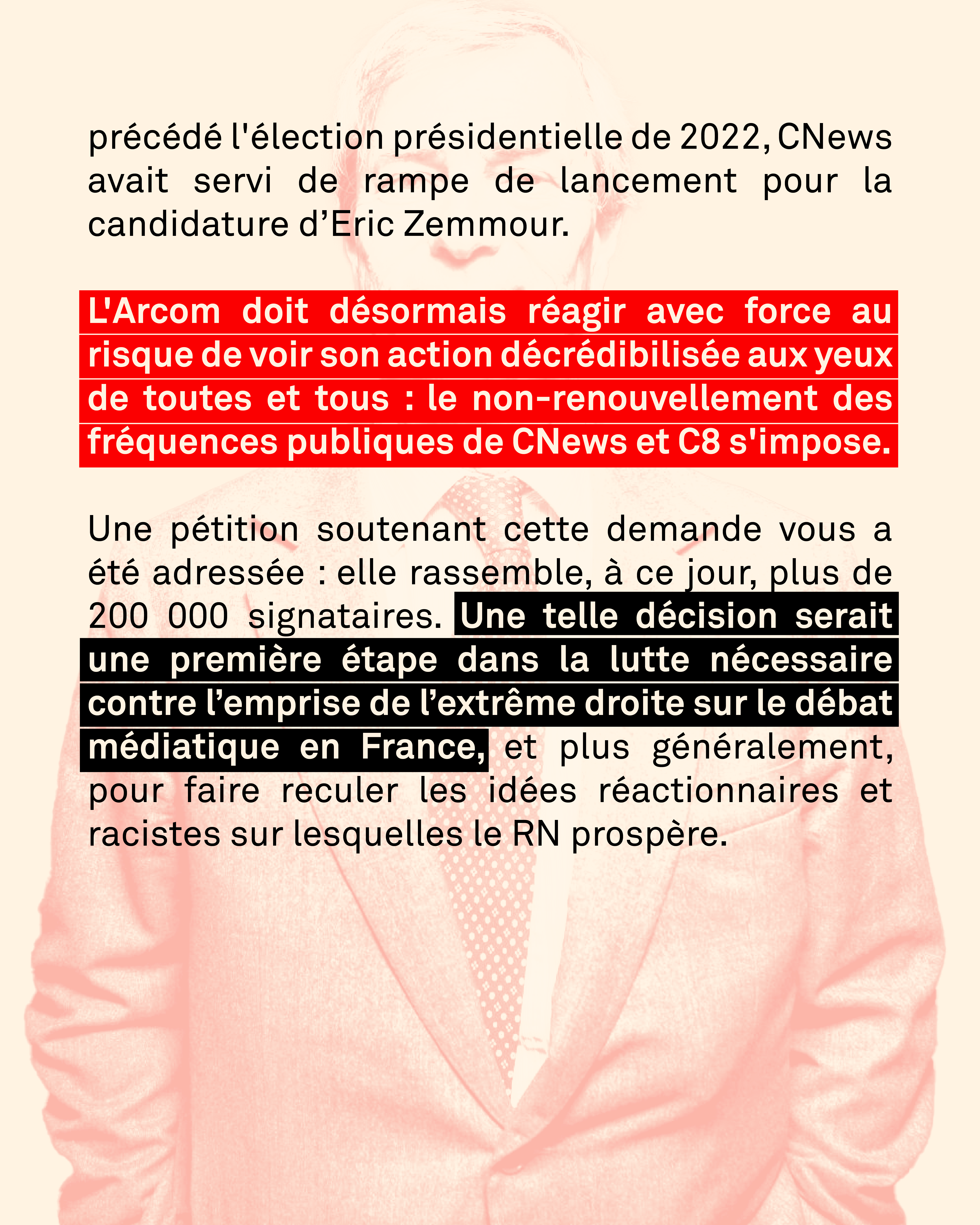 L'Arcom doit désormais réagir avec force au risque de voir son action décrédibilisée aux yeux de toutes et tous : le non-renouvellement des fréquences publiques de CNews et C8 s'impose. Une pétition soutenant cette demande vous a été adressée : elle rassemble, à ce jour, plus de 200 000 signataires. Une telle décision serait une première étape dans la lutte nécessaire contre l’emprise de l’extrême droite sur le débat médiatique en France, et plus généralement, pour faire reculer les idées réactionnaires et racistes sur lesquelles le RN prospère.