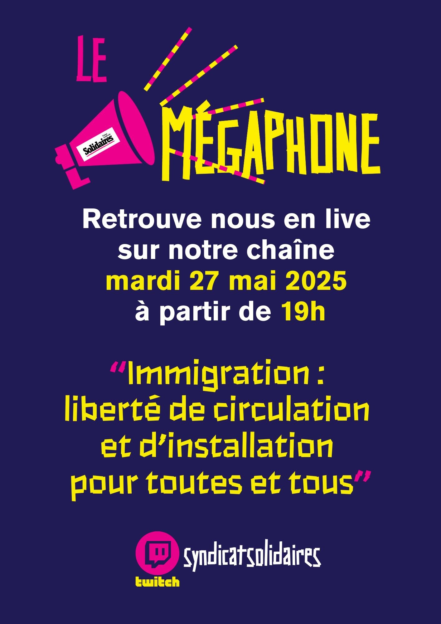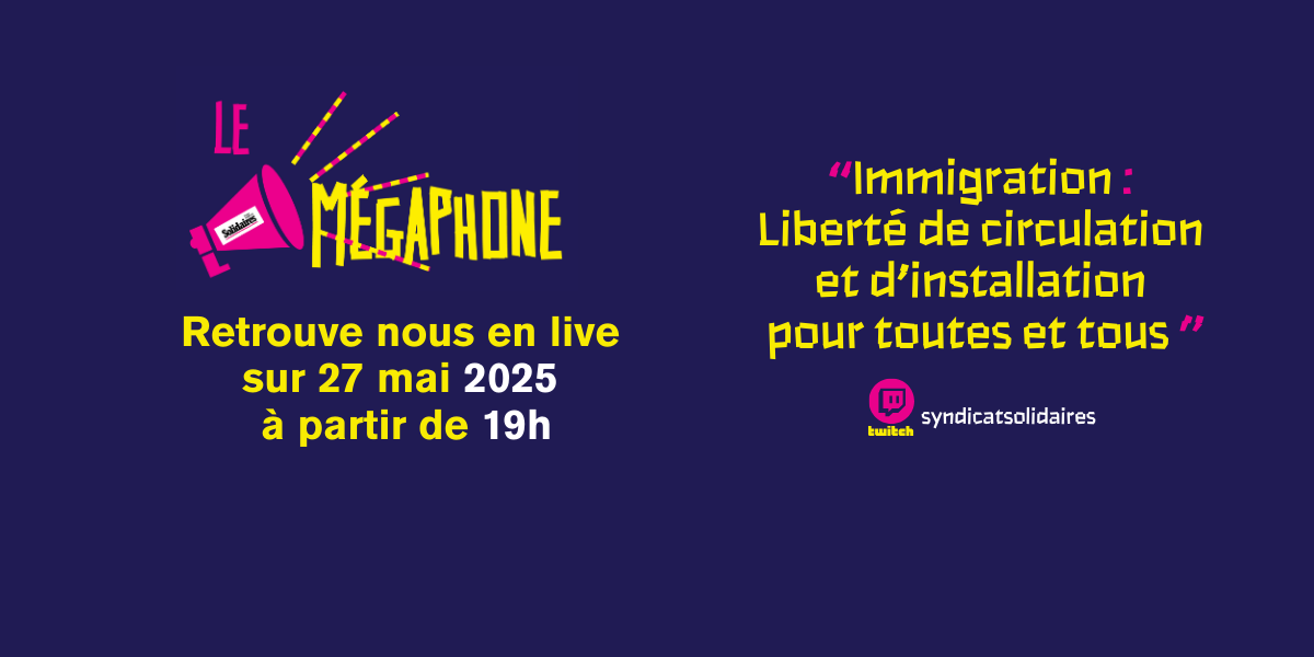 La prochaine émission du Mégaphone aura lieu sur la chaine Twitch de l'Union syndicale Solidaires le mardi 27 mai.