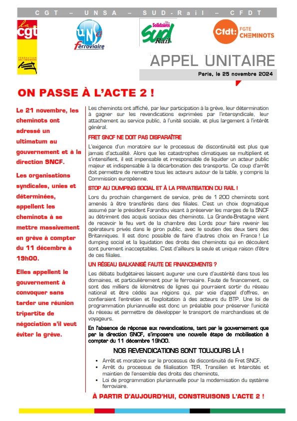 Les organisations syndicales CGT - UNSA - SUD-Rail - CFDT, unies et déterminées, appellent les cheminots à se mettre massivement en grève à compter du 11 décembre à 19h00.