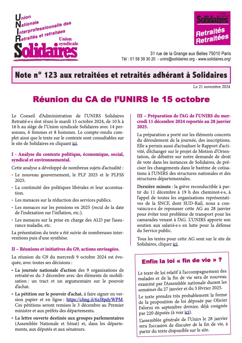 Le Conseil d’Administration de l’UNIRS Solidaires Retraité·e·s s’est réuni le mardi 15 octobre 2024, de 10 h à 16 h au siège de l’Union syndicale Solidaires avec 14 personnes, 6 femmes et 8 hommes. Le compte-rendu complet ainsi que le texte sur le contexte sont consultables sur le site de Solidaires : https://solidaires.org/sinformer-et-agir/actualites-et-mobilisations/sectorielles/compte-rendu-du-ca-de-lunirs-du-10-octobre-2024/