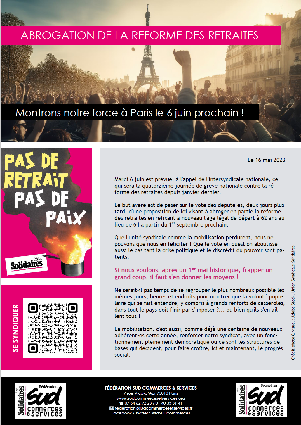 Mardi 6 juin est prévue, à l'appel de l'intersyndicale nationale, ce qui sera la quatorzième journée de grève nationale contre la réforme des retraites depuis janvier dernier.