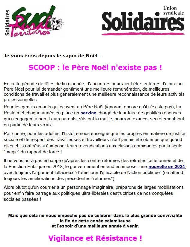 Alors plutôt qu'un courrier à un personnage imaginaire, préparons de larges mobilisations pour enfin faire barrage aux politiques ultra-libérales destructrices de nos conquêtes sociales passées !