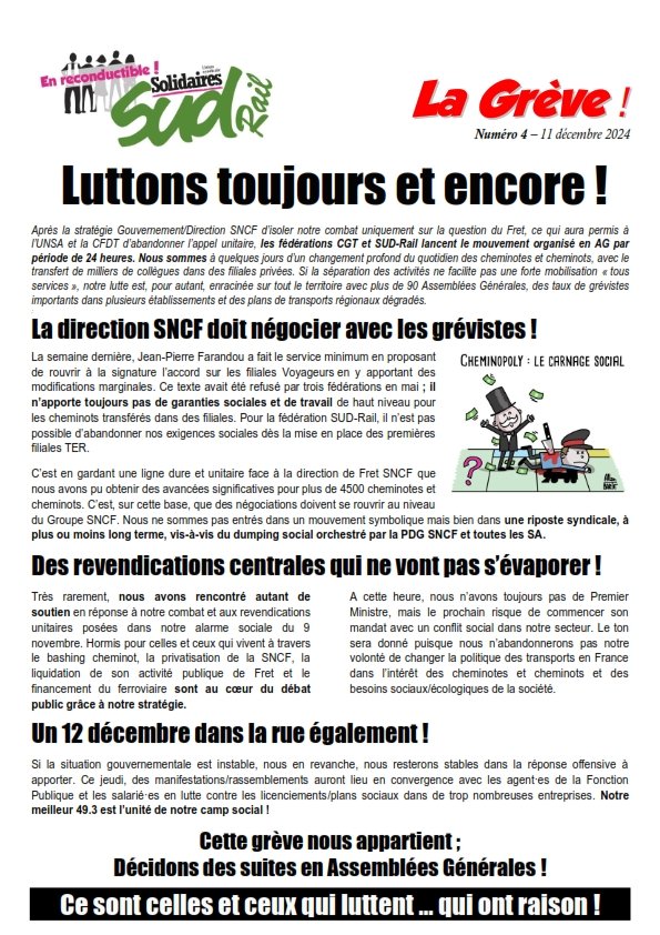 Après la stratégie Gouvernement/Direction SNCF d’isoler notre combat uniquement sur la question du Fret, ce qui aura permis à l’UNSA et la CFDT d’abandonner l’appel unitaire, les fédérations CGT et SUD-Rail lancent le mouvement organisé en AG par période de 24 heures. Nous sommes à quelques jours d’un changement profond du quotidien des cheminotes et cheminots, avec le transfert de milliers de collègues dans des filiales privées. Si la séparation des activités ne facilite pas une forte mobilisation « tous services », notre lutte est, pour autant, enracinée sur tout le territoire avec plus de 90 Assemblées Générales, des taux de grévistes importants dans plusieurs établissements et des plans de transports régionaux dégradés.