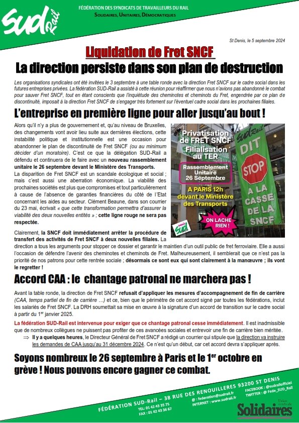 Alors qu’il n’y a plus de gouvernement et, qu’au niveau de Bruxelles, des changements vont avoir lieu suite aux dernières élections, cette instabilité politique et institutionnelle est une occasion pour abandonner le plan de discontinuité de Fret SNCF (ou au minimum décider d’un moratoire). C’est ce que la délégation SUD-Rail a défendu et continuera de le faire avec un nouveau rassemblement unitaire le 26 septembre devant le Ministère des Transports.