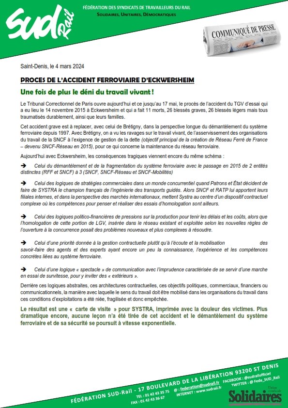 Le Tribunal Correctionnel de Paris ouvre aujourd’hui et ce jusqu’au 17 mai, le procès de l’accident du TGV d’essai qui a eu lieu le 14 novembre 2015 à Eckwersheim et qui a fait 11 morts, 26 blessés graves, 26 blessés légers mais tous traumatisés durablement, ainsi que leurs familles.