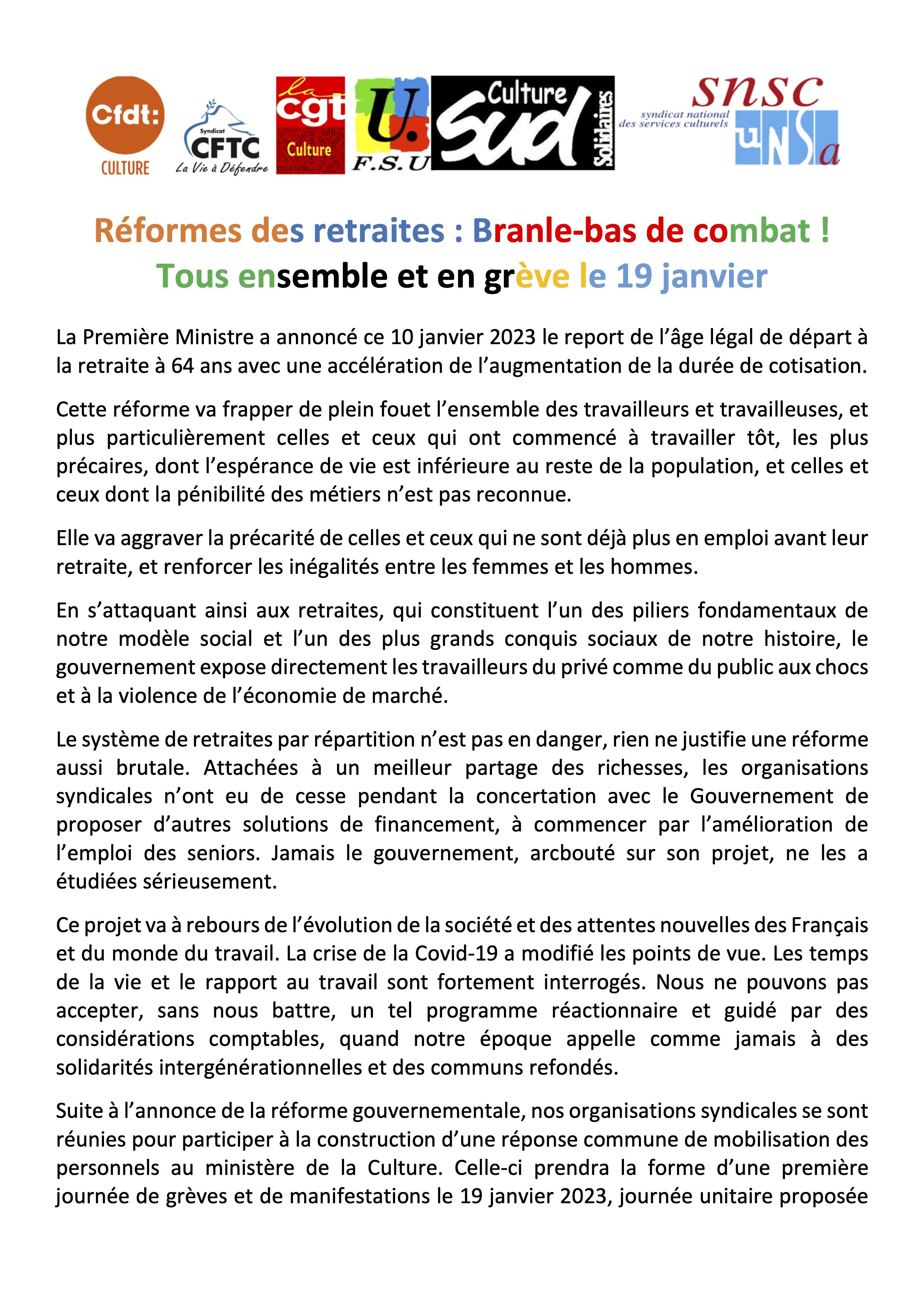 Suite à l’annonce de la réforme gouvernementale, nos organisations syndicales se sont réunies pour participer à la construction d’une réponse commune de mobilisation des personnels au ministère de la Culture. Celle-ci prendra la forme d’une première journée de grèves et de manifestations le 19 janvier 2023, journée unitaire proposée