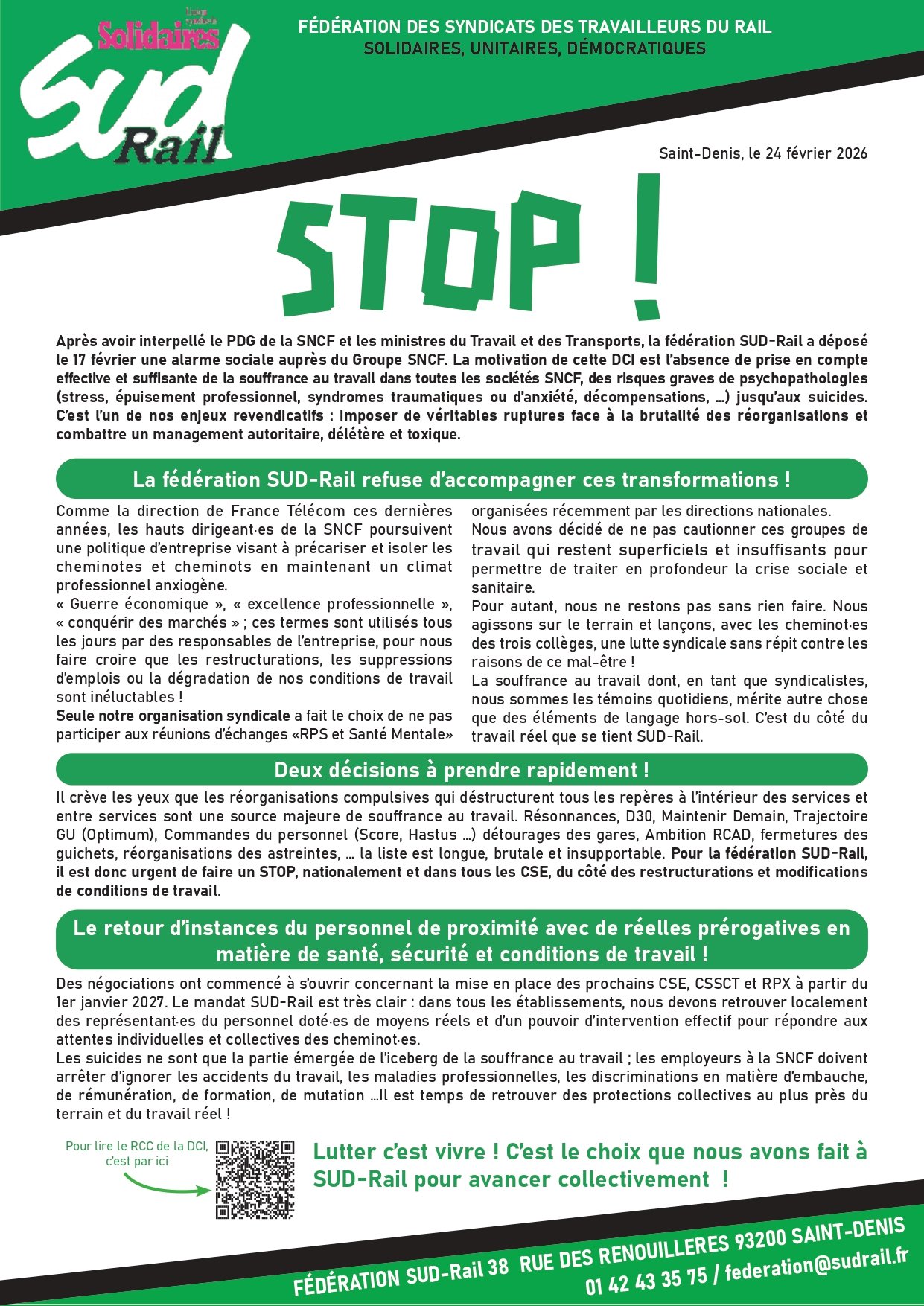 Après avoir interpellé le PDG de la SNCF et les ministres du Travail et des Transports, la fédération SUD-Rail a déposé le 17 février une alarme sociale auprès du Groupe SNCF. La motivation de cette DCI est l’absence de prise en compte effective et suffisante de la souffrance au travail dans toutes les sociétés SNCF, des risques graves de psychopathologies (stress, épuisement professionnel, syndromes traumatiques ou d’anxiété, décompensations, …) jusqu’aux suicides. C’est l’un de nos enjeux revendicatifs : imposer de véritables ruptures face à la brutalité des réorganisations et combattre un management autoritaire, délétère et toxique.