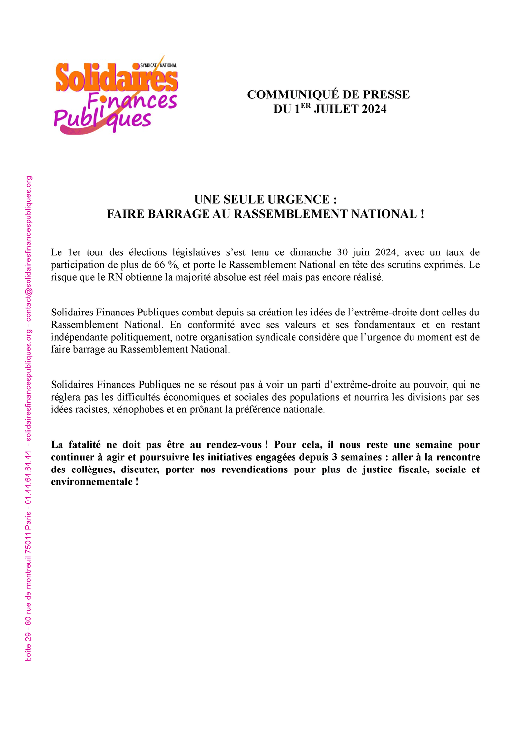Solidaires Finances Publiques combat depuis sa création les idées de l’extrême-droite dont celles du Rassemblement National. En conformité avec ses valeurs et ses fondamentaux et en restant indépendante politiquement, notre organisation syndicale considère que l’urgence du moment est de faire barrage au Rassemblement National.