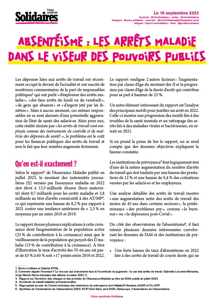 Oui ces données sont alarmantes et confirment la nécessité d’appréhender les spécificités des situations de travail, de comprendre les causes de l’absentéisme pour le réduire. Certes il peut y avoir des abus et y mettre un terme est légitime. Mais ce qui ne l’est pas, c’est la nature de la réponse du politique purement comptable et stigmatisante pour les salarié·es et la profession médicale et qui ne règlera rien au fond.