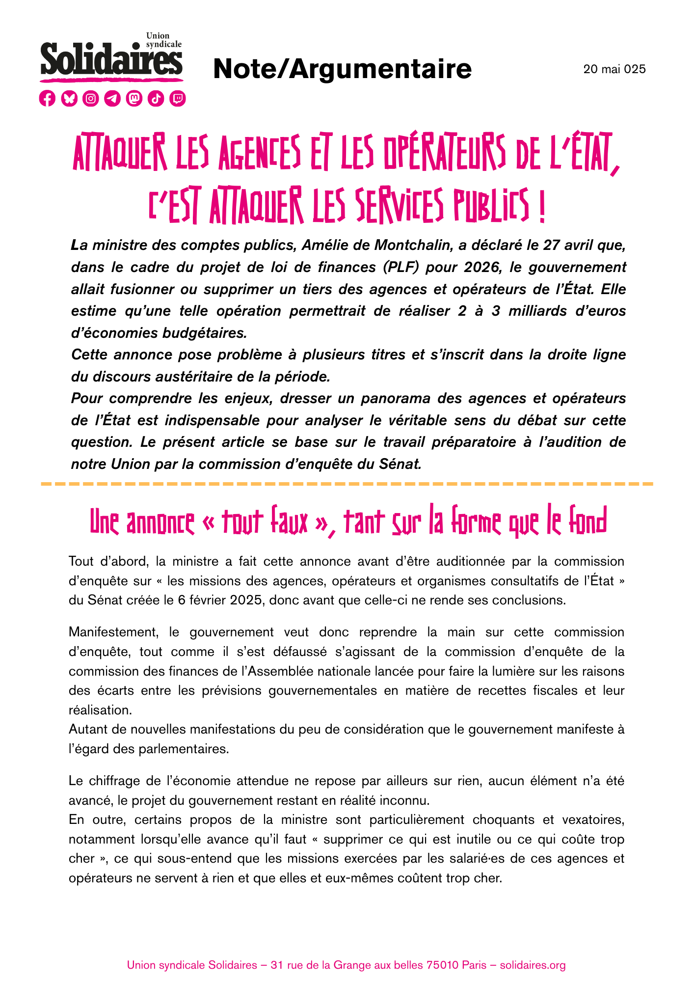 Le chiffrage de l’économie attendue ne repose par ailleurs sur rien, aucun élément n’a été avancé, le projet du gouvernement restant en réalité inconnu. En outre, certains propos de la ministre sont particulièrement choquants et vexatoires, notamment lorsqu’elle avance qu’il faut « supprimer ce qui est inutile ou ce qui coûte trop cher », ce qui sous-entend que les missions exercées par les salarié·es de ces agences et opérateurs ne servent à rien et que elles et eux-mêmes coûtent trop cher.