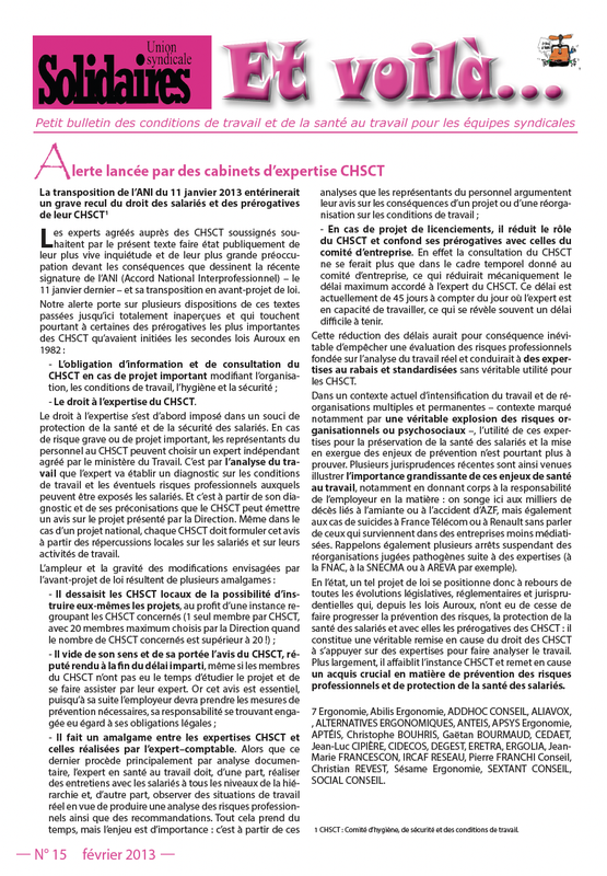 - Alerte lancée par des cabinets d’expertise CHSCT
