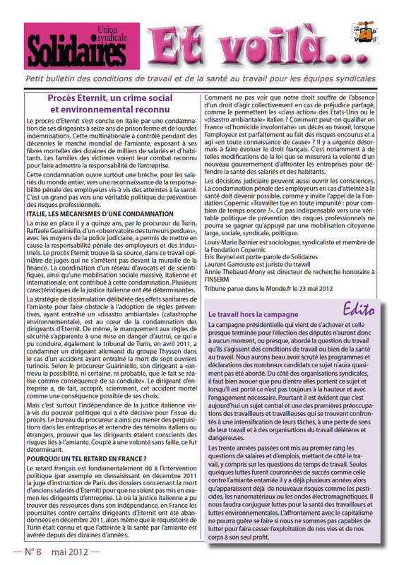 - Tribune Procès Eternit, un crime social et environnemental reconnu ;