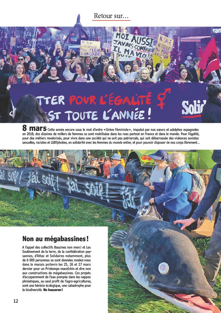 A l’appel des collectifs Bassines non merci et Les Soulèvement de la terre, de la confédération paysannes, d’Attac et Solidaires notamment, plus de 6 000 personnes se sont données rendez-vous dans le marais poitevin les 25, 26 et 27 mars dernier pour un Printemps maraîchin et dire non aux constructions de mégabassines. Ces projets d’accaparement de l’eau pompée dans les nappes phréatiques, au seul profit de l’agro agricultures, sont une hérésie écologique, une catastrophe pour la biodiversité.