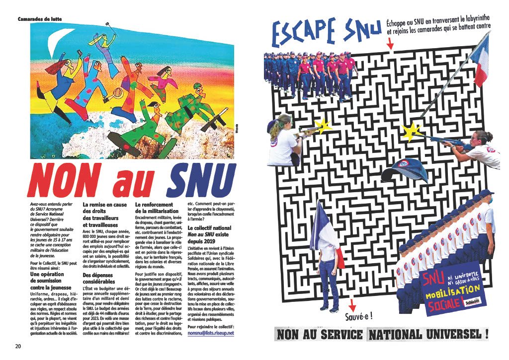 Le collectif national Non au SNU existe depuis 2019. L’initiative en revient à l’Union pacifiste et l’Union syndicale Solidaires qui, avec la Fédération nationale de la Libre Pensée, en assurent l’animation. Nous avons produit plusieurs tracts, communiqués, autocollants, affiches, assuré une veille à propos des séjours annuels des volontaires et des déclarations gouvernementales, soutenu la mise en place de collectifs locaux dans plusieurs villes, organisé des rassemblements et réunions publiques.