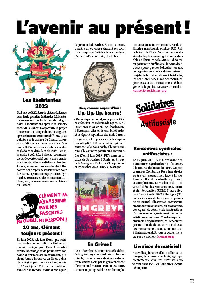 En juin 2023, cela fera 10 ans que notre camarade Clément Méric a été tué par des néo-nazis, en plein Paris. Afin de lui rendre hommage et de poursuivre son combat antifasciste notamment, plusieurs jours d'initiatives en divers points de la région parisienne sont organisés du 1er au 5 juin 2023. La manifestation annuelle se tiendra le dimanche 4 juin, départ à 11 h de Barbès.