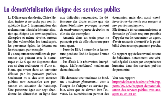 La Défenseure des droits, Claire Hédon, insiste et ne cache pas son inquiétude face à l’augmentation des réclamations liées à la dématérialisation qui éloigne des services publics, désespère et même révolte, surtout les plus vulnérables, les handicapés, les personnes âgées, les détenus ou les étrangers, par exemple.
