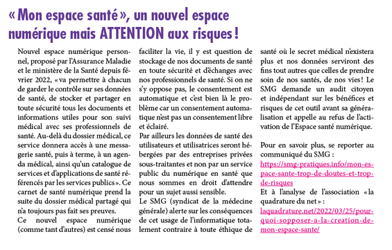 Ce nouvel espace numérique (comme tant d’autres) est censé nous faciliter la vie, il y est question de stockage de nos documents de santé en toute sécurité et d’échanges avec nos professionnels de santé. Si on ne s’y oppose pas, le consentement est automatique et c’est bien là le problème car un consentement automatique n’est pas un consentement libre et éclairé.