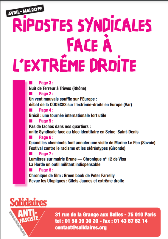 Au sommaire de ce numéro, on trouve notamment un retour sur la tournée de notre camarade brésilien de la CSP Conlutas, la réaction intersyndicale suite à l’occupation de la CAF de Bobigny par Génération identitaire, l’action de SUD-Rail qui a permis de faire annuler la venue de Marine le Pen à la Rotonde de Chambéry... et plein d’autres choses.