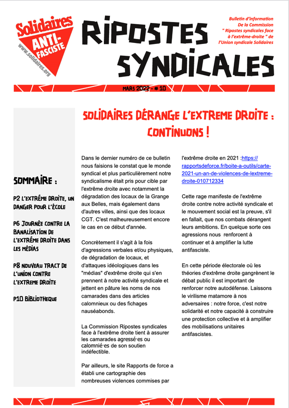Bulletin d’information n° 10 du groupe de travail « Ripostes syndicales face à l’extrême-droite » de l’Union syndicale Solidaires.