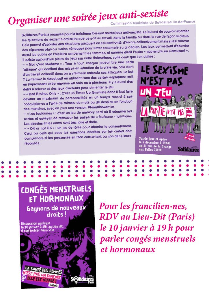 La Commission féministe de Solidaires Ile de France, avec Solidaires Paris, a organisé pour la troisième fois une soirée jeux anti-sexiste. Le but est de pouvoir aborder les questions de sexisme ordinaire que ce soit au travail, dans la famille ou dans la rue de façon ludique. Cela permet d’aborder des situations auxquels on est confronté, d’en rire collectivement mais aussi trouver des réponses plus ou moins sérieuses pour lutter ensemble au quotidien. Les jeux permettent d’aborder aussi les oublis de l’histoire concernant les femmes, et comme dirait l’autre « apprendre en s’amusant ».