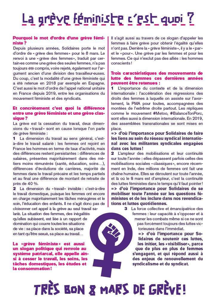 Depuis plusieurs années, Solidaires porte le mot d’ordre de « grève des femmes » pour le 8 mars. Le renvoi à une « grève des femmes », traduit par certain·es comme une grève des seules femmes, n’a pas toujours été compris, voire rejeté, également sur l’argument ancien d’une division des travail- leur·euses. Du coup, c’est la modalité d’une grève féministe qui a été retenue en 2018 par exemple en Espagne. C’est aussi le mot d’ordre de l’appel national unitaire en France depuis 2019, entre les organisations du mouvement féministe et des syndicats.