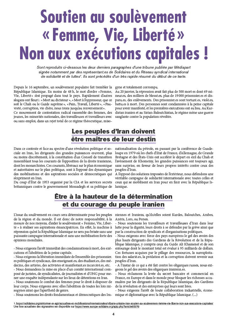- Nous soutenons les travailleurs et travailleuses d’Iran dans leur lutte pour la dignité, leurs droits à se défendre par la grève ainsi que par la construction de syndicats et d’organisations politiques.
