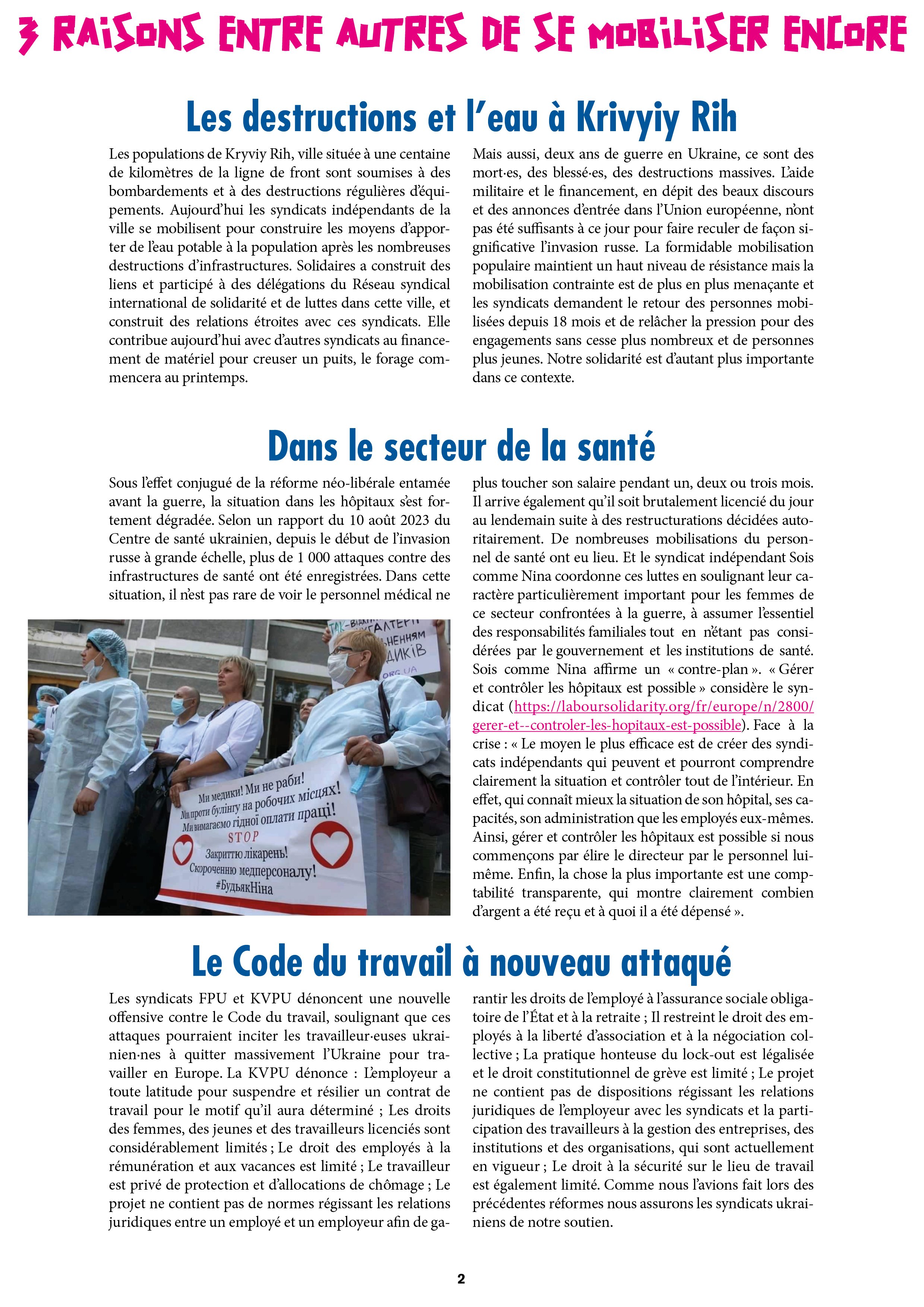 Sous l’effet conjugué de la réforme néo-libérale entamée avant la guerre, la situation dans les hôpitaux s’est fortement dégradée. Selon un rapport du 10 août 2023 du Centre de santé ukrainien, depuis le début de l’invasion russe à grande échelle, plus de 1 000 attaques contre des infrastructures de santé ont été enregistrées. Dans cette situation, il n’est pas rare de voir le personnel médical ne plus toucher son salaire pendant un, deux ou trois mois. Il arrive également qu’il soit brutalement licencié du jour au lendemain suite à des restructurations décidées autoritairement. De nombreuses mobilisations du personnel de santé ont eu lieu. Et le syndicat indépendant Sois comme Nina coordonne ces luttes en soulignant leur caractère particulièrement important pour les femmes de ce secteur confrontées à la guerre, à assumer l’essentiel des responsabilités familiales tout en n’étant pas considérées par le gouvernement et les institutions de santé. Sois comme Nina affirme un « contre-plan ». « Gérer et contrôler les hôpitaux est possible » considère le syndicat (https://laboursolidarity.org/fr/europe/n/2800/gerer-et--controler-les-hopitaux-est-possible). Face à la crise : « Le moyen le plus efficace est de créer des syndicats indépendants qui peuvent et pourront comprendre clairement la situation et contrôler tout de l’intérieur. En effet, qui connaît mieux la situation de son hôpital, ses capacités, son administration que les employés eux-mêmes. Ainsi, gérer et contrôler les hôpitaux est possible si nous commençons par élire le directeur par le personnel lui-même. Enfin, la chose la plus importante est une comptabilité transparente, qui montre clairement combien d’argent a été reçu et à quoi il a été dépensé ».