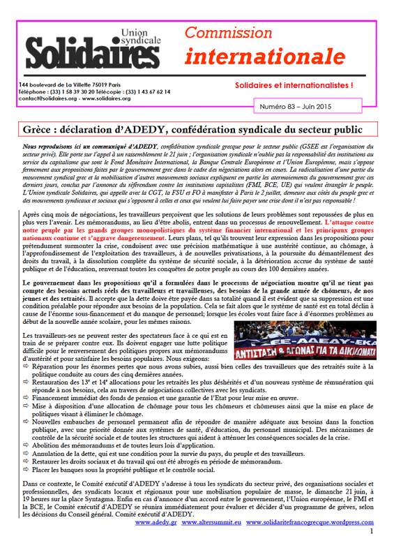 Grèce : déclaration d’ADEDY, confédération syndicale du secteur public